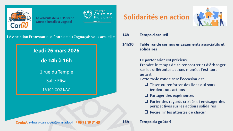 Vendredi 20 mars Journée Entraide 10h30 Temps d’intercession et Sainte-Cène,12h repas, 14 h atelier