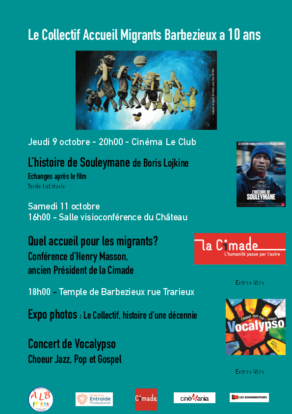 Dans la cadre des 10 ans du Collectif Accueil Migrants de Barbezieux, plusieurs événements les 9 et 11 octobre dont le concert Vocalypso le samedi 11 octobre au Temple de Barbezieux